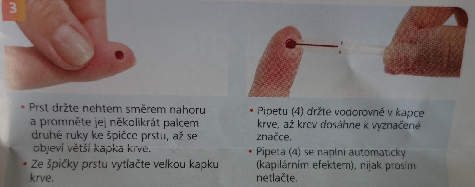 - návod ne zcela srozumitelný (na obrázku je prst zobrazený vodorovně nehtem dolů, ale v popisu je „prst držte nehtem směrem nahoru“ a dále je na fotce prst svisle, pipeta vodorovně a že prý „se naplní automaticky“, což mi se teda nestalo)