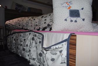 Povlečení, mantinel, kapsář a kapsář k posteli rodičů.