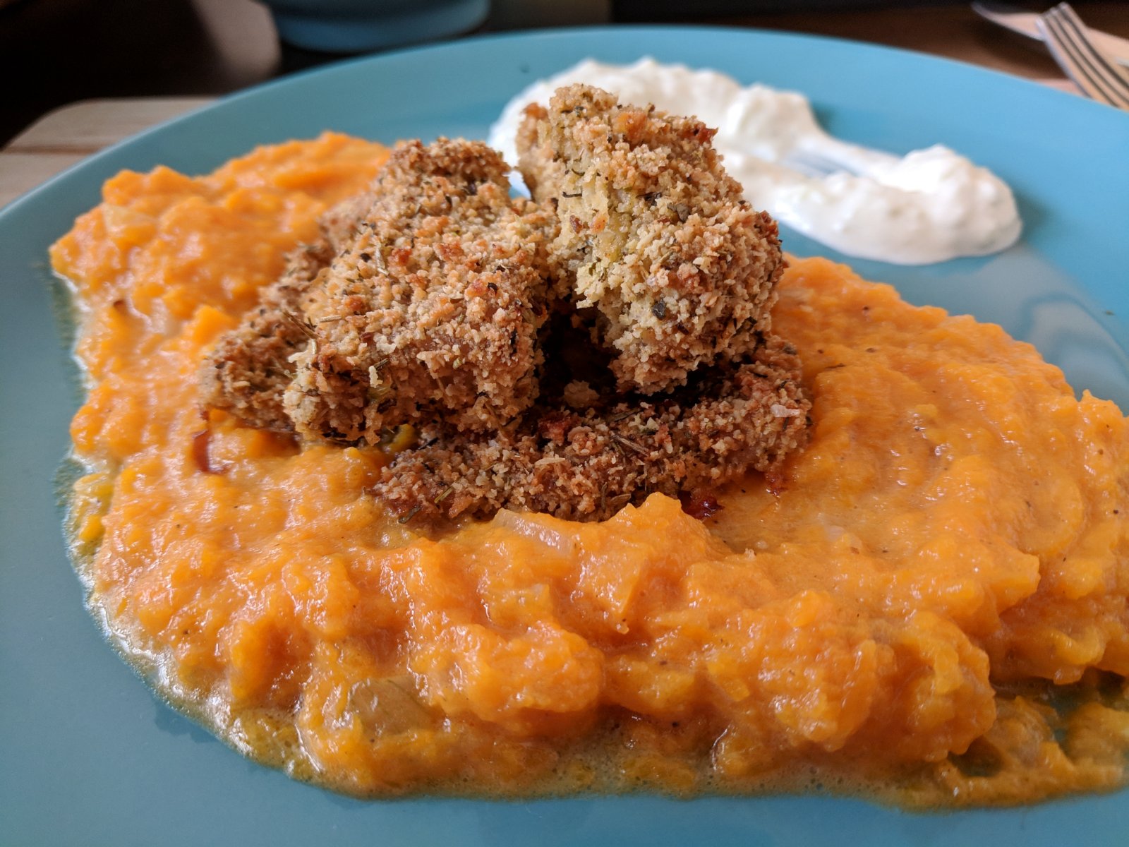 Bravčové nugetky pečené v trúbe, tekvicové pyré, dip s uhorkou a cesnakom