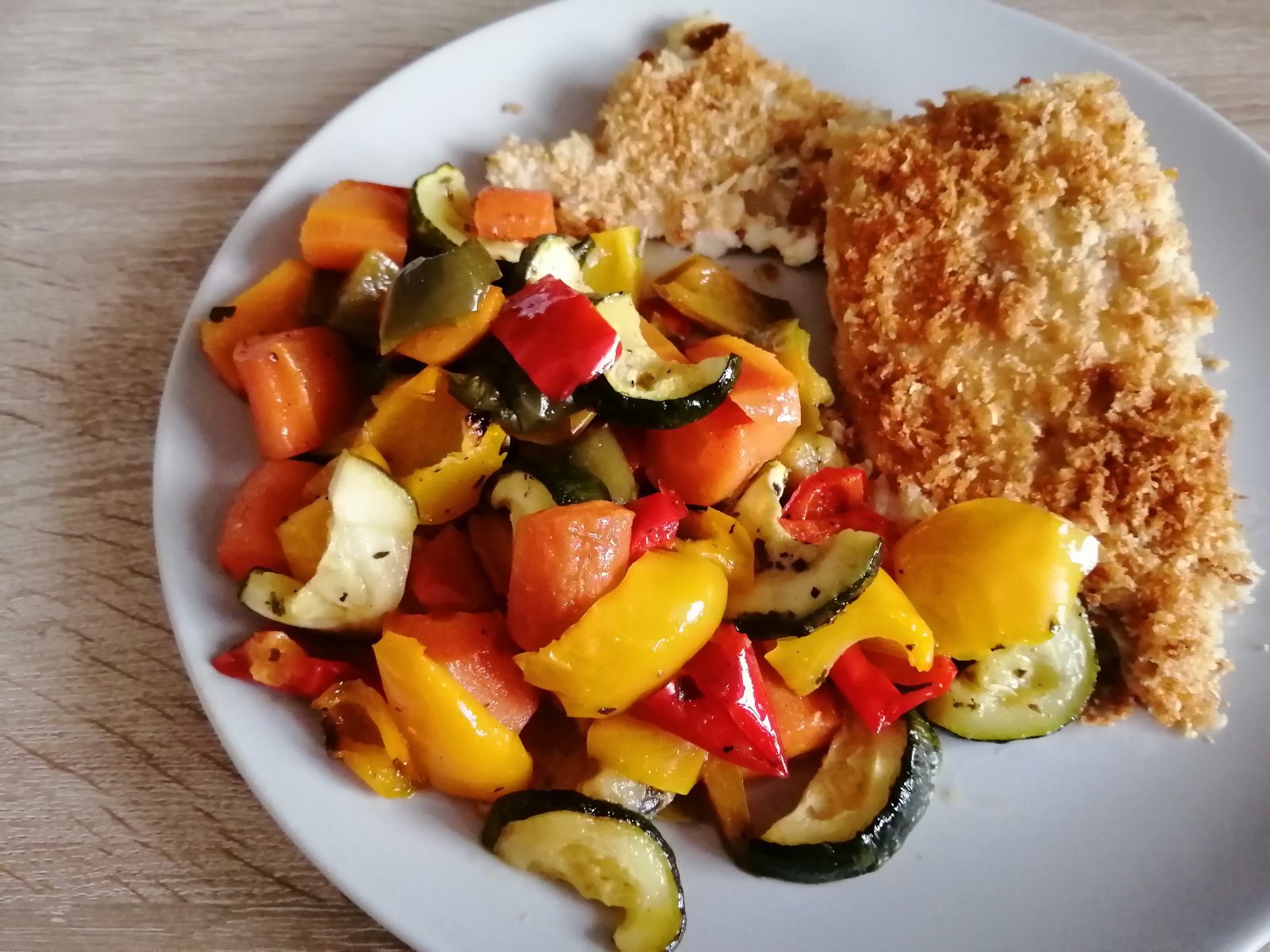 Treska: tresku osoliť, okoreniť, naniesť biely jogurt a posypať zmesou ( 3 rozmixované plátky bieleho toastového chleba zmiešané s 30g nastrúhaného syra Grana Padano), zmes trošku pritlačiť na povrch tresky. Piecť na 180 stupňov cca 25 minút.