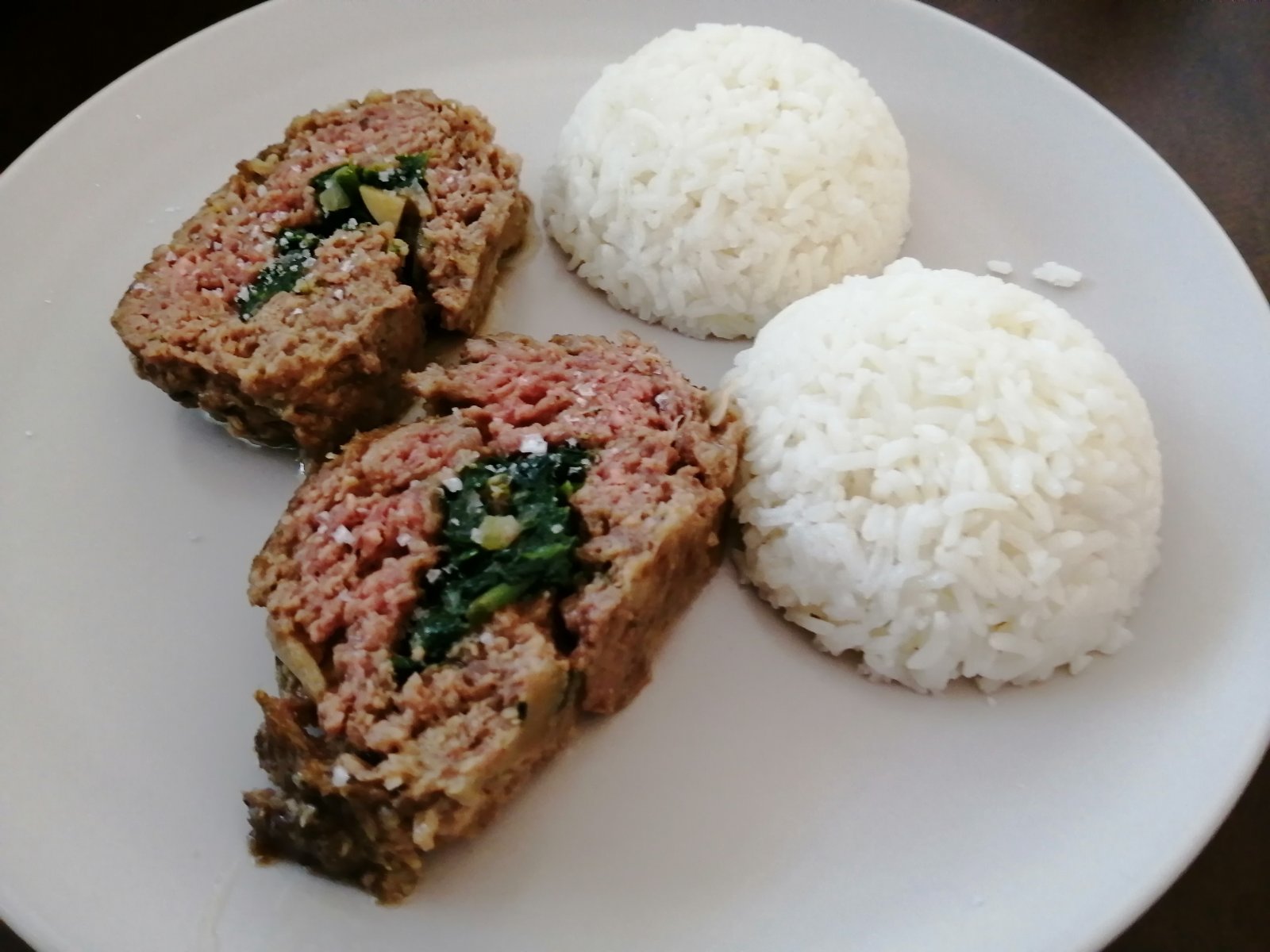 1kg mletého mäsa ( tu hovädzie), 250g čerstvého špenátu, 100g tvrdého syra ( tu gouda), 3 stredne veľké cibuľe, 4 strúčiky cesnaku,2 vajíčka, soľ, korenie, 2 PL majoránky, 1 ČL sušeného cesnaku, 3 PL strúhanky, 1 ČL mletého kmínu. Postup : Na oleji speníme cibuľku a 2/3 z nej si odoberieme do misky a necháme vychladnúť. Do 1/3 cibuľky na panvici pridáme na kúsky nakrájaný cesnak a špenát, necháme spariť, posolíme a pokoreníme. V miske si zmiešame mäso, cibuľu, vajíčka, strúhanku, nastrúhaný syr a dochutíme majoránkou, kmínom, sušeným cesnakom, soľou a korením. Zmes si rozprestrieme na alobal, poukladáme špenátovú zmes a zarolujeme. Prenesieme na plech a alobal odstránime, pokvapkáme trochou oleja. Pečieme na 160 stupňov cca 35 minút.