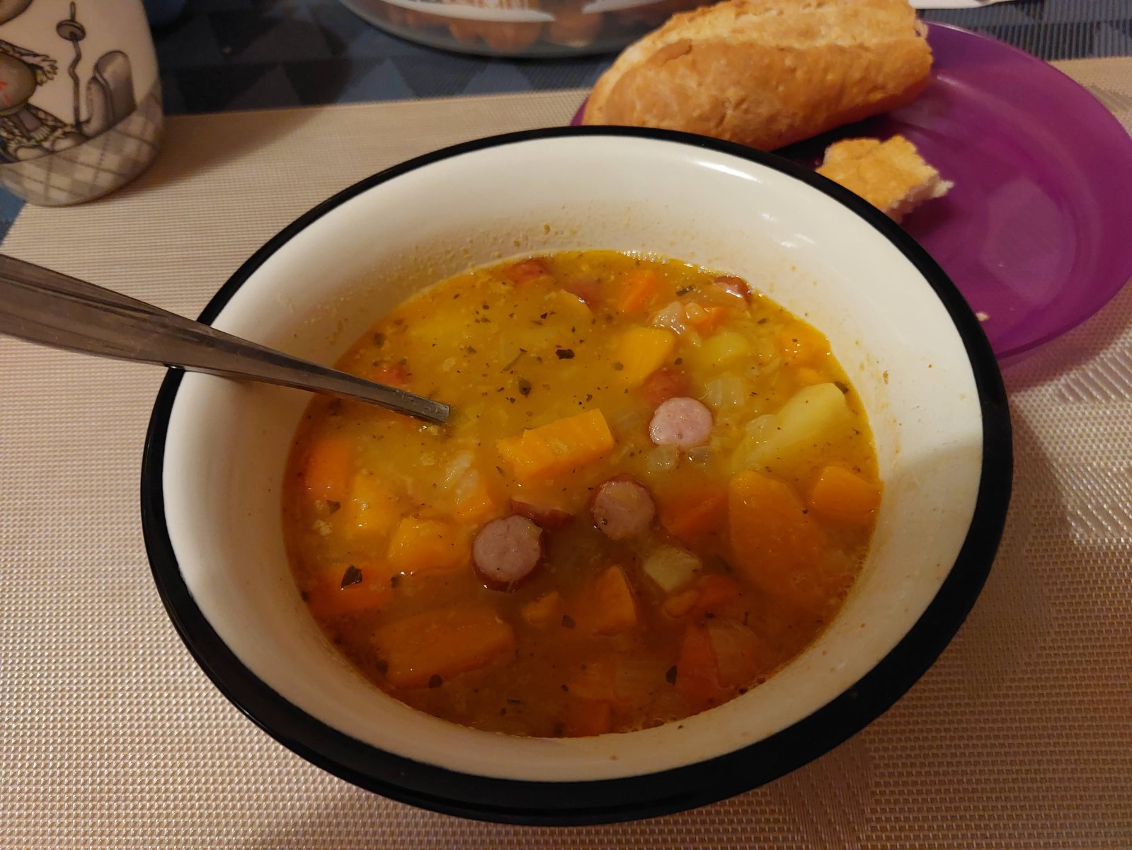 Na oleji si opražíme dozlatova cca 2 stredne veľké cibuľe, potom zalejeme 2500ml vody, pridáme 3-4 očistené a na kolieska nakrájanej mrkvy, cca 500g očistených a nakrájaných batátov, cca 300-400g zemiakov. Osolíme, okoreníme, pridáme 1PL sladkej červenej papriky, 1PL kari, trochu majoránky, prípadne trochu provensálskeho korenia, 1ČL drteného kmínu. Necháme cca 20-30 minút povariť. Potom pridáme cca 300g červenej šošovice a opečené a na kolieska nakrájané frankfurtské klobásky ( množstvo ako chcete alebo možno úplne vynechať). Povaríme, kým sa červená šošovica trochu nerozvarí ( a tým pekne polievku zahustí). Hotovo 🙂
