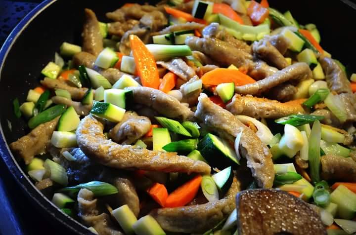 Z polotuhého těsta na mokré desce oddělujete špachtlí nudle, které stečou do vroucí vody.