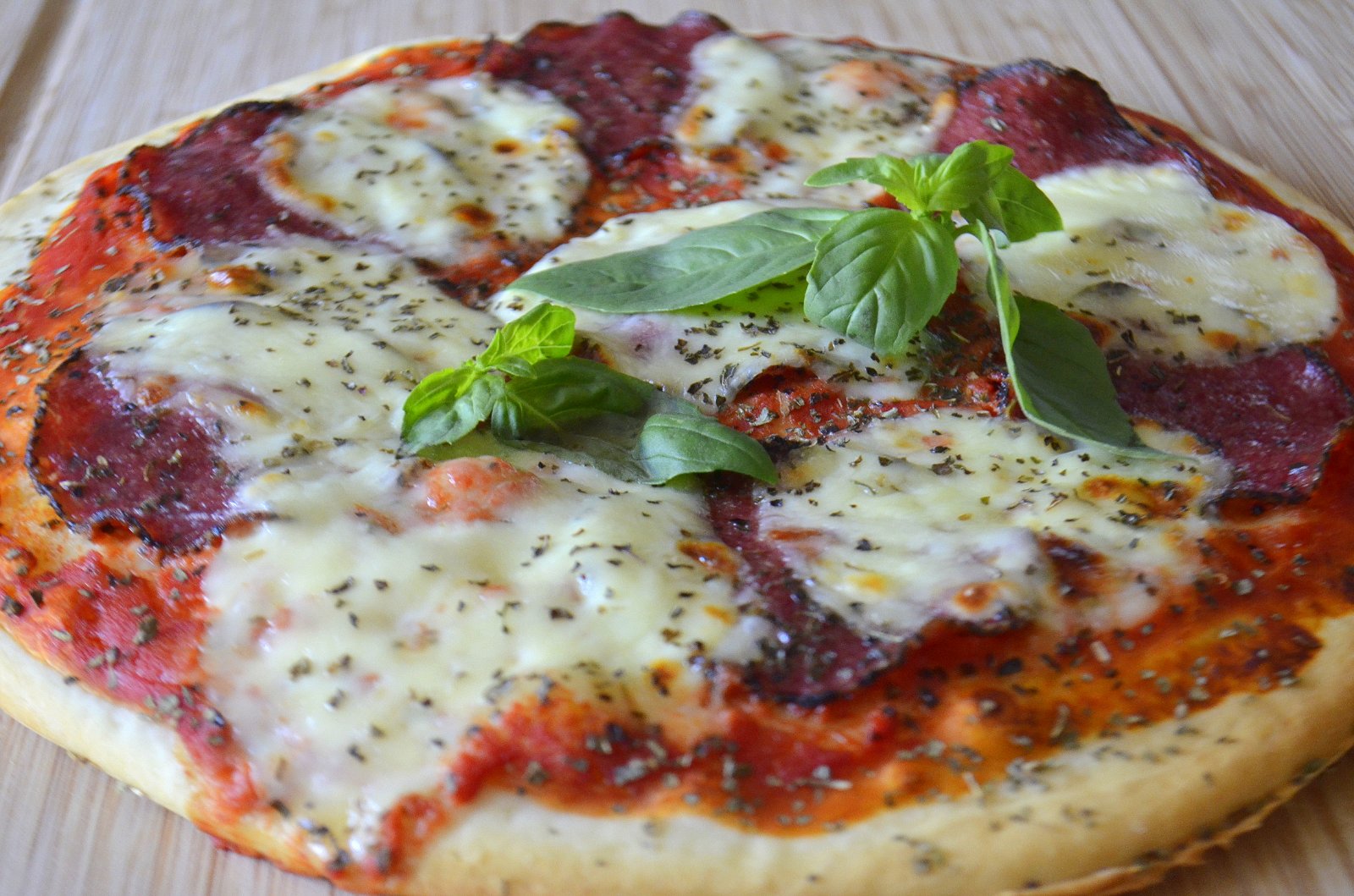 V míse, kam dávám už celé množství mouky, si v rohu zaděláme kvásek, necháme 10 minut vzejít a poté přidáme olej, vodu, sůl. Ručně hnětu asi 5 minut. Těsto nechám 40 min . kynout na teplém místě. Pak těsto rozdělím na 2 bochníky, ze kterých vyválím placku o průměru 30 cm. Potřu rajčatovým sugem, pokladu hovězím salámem, mozzarellou a posypu sušenou bazalkou/oreganem. Peču na 250 °C v dobře rozehřáté troubě 7 minut.