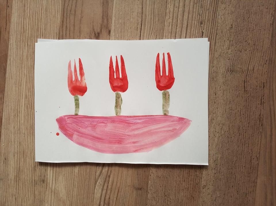 Tenhle obrázek s mojí dopomocí zvládl namalovat dva a půl letý syn. Picasso z něj nebude, ale využití netradičních pomůcek - vidlička a prst (normálně maluje štětcem), ho vyloženě nadchlo. Natrénovali jsme si dělání rovných čár, řekli jsme si něco o květinkách, zopakovali barvy...