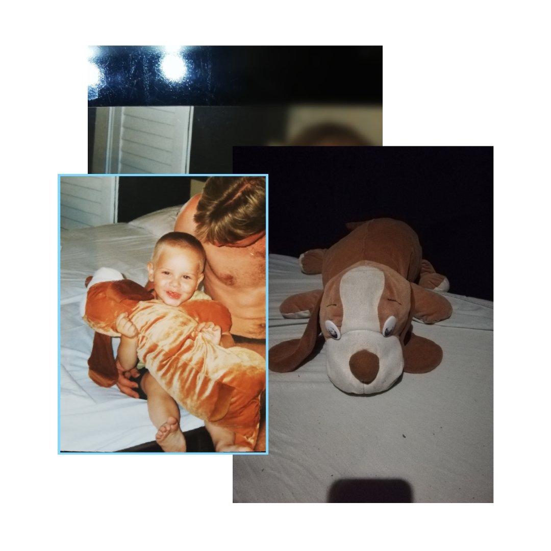 Toník má od narození plyšového psa,vypadá už hrozně.Tonikovi bude v dubnu 11 a stále se ho nechce vzdát.