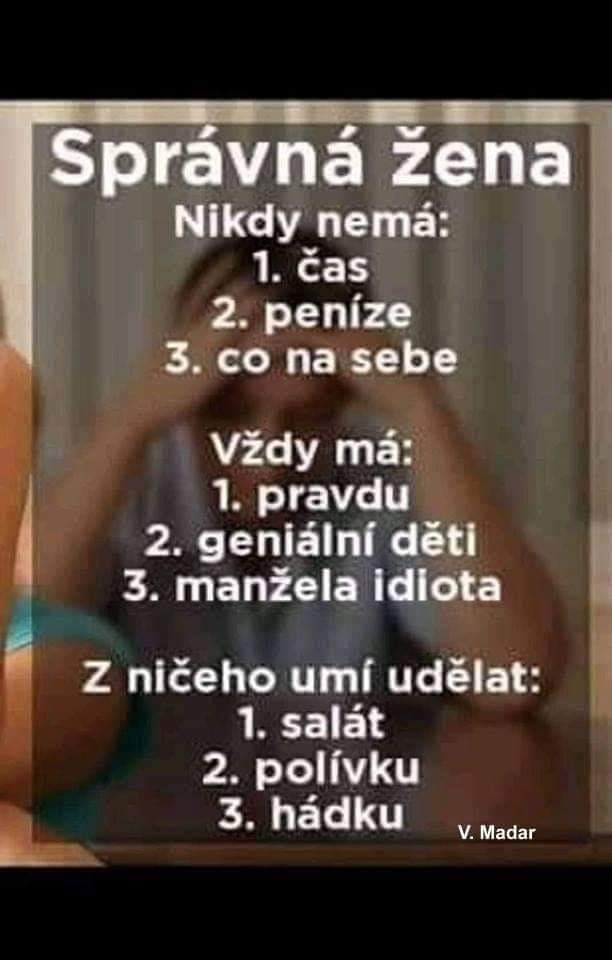 😂😂😂 ja jsem asi omyl😂😂😂 Mam cas, penize i co na sebe. Pac vetsinou chodim v ordinacnim, mam vseho az moc .... jelikoz nejsem idiot, tak si uvedomuji, ze nemam patent na pravdu. Bod 2 plati, genialni deti mam, jak jinak.... Manzel je ok. Salat ani polivku moc neresim, pac varim sporadicky. A Hadky nesnasim, prcham. Sakra, ja jsem asi kozatej chlap😂😂😂 ( ja si to trochu myslim celej zivot....)