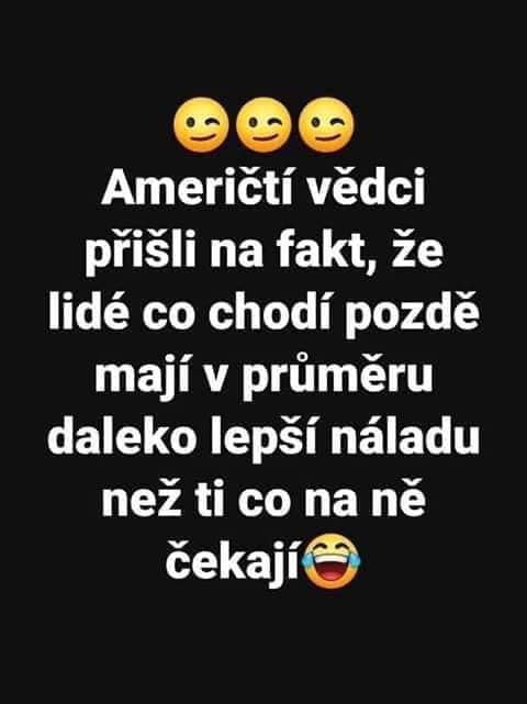 Já chodím na čas, nebo o 5 min dřív moje tchýně vždy když máme nek jet tak přijde pozdě , pokud bere děti nebo jde náladě tak v čas ....už jsem i přemýšlela zda to má úmyslně rozdělené nebo je to náhoda