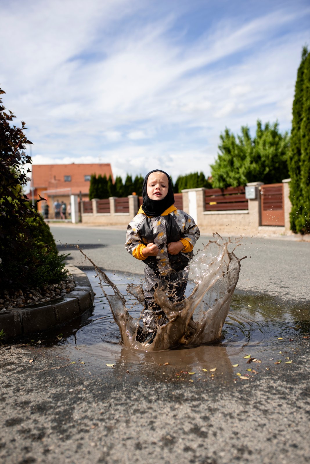 Já jsem tak ráda, že nejsme jediní, komu si dítě hraje v loužích! Tady kolem nás (pražské sídliště) je většina dětí vyšňořených v legínkách a teniskách nebo dokonce balerínkách, louže pod přísným pohledem rodičů obchází obloukem. Zatímco to naše "zvíře" skočí do každé louže a je mu jedno, co má na sobě. Tak už jsem nějaké vysvětlování a zakazování vzdala a když je mokro, tak chodí v holinách a nepromokavém od hlavy k patě. A je šťastný. Jen mám tedy občas divný pocit, když jdou kolem toho našeho Jóžina z bažin ty princezny a rodiče nás sjíždí všelijakými pohledy 😂