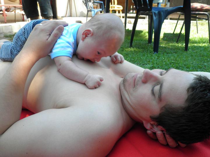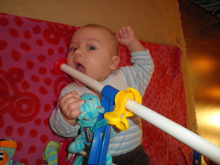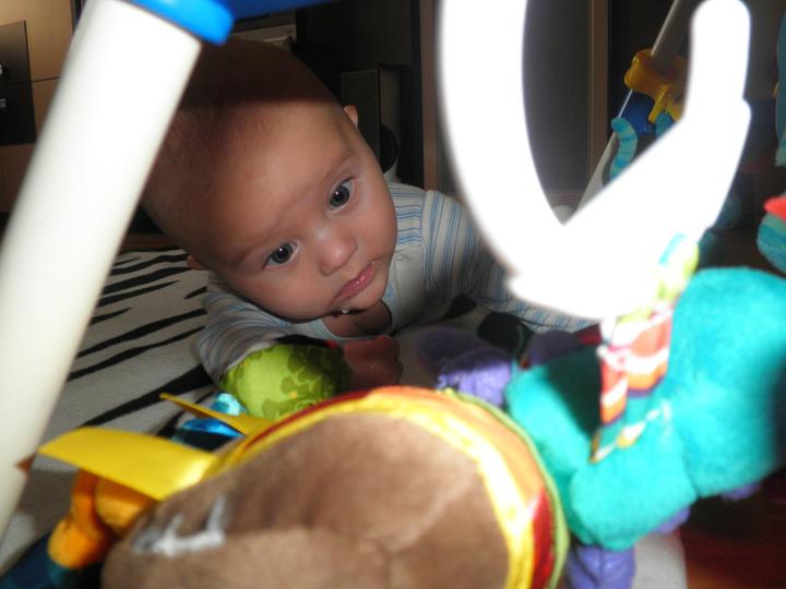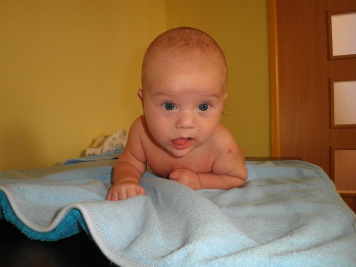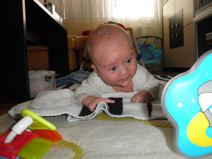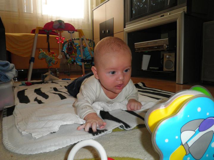 Dnes jsme zkusili první příkrm ( domácí mrkvičku) a moc jsme neuspěli, snědl pár lžiček a pak to zapil mlékem :( Zítra zkusíme zase 🙂 A ode dneška se začal sám převracet na bříško 🙂 Dělá nám radost