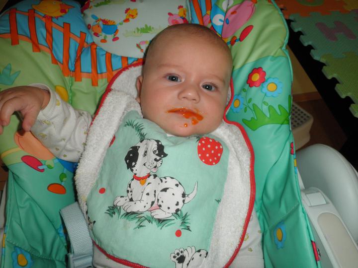 Tak už papáme mrkev s brambůrkem a chutná za pár dnů přijde na řadu brokolice 🙂