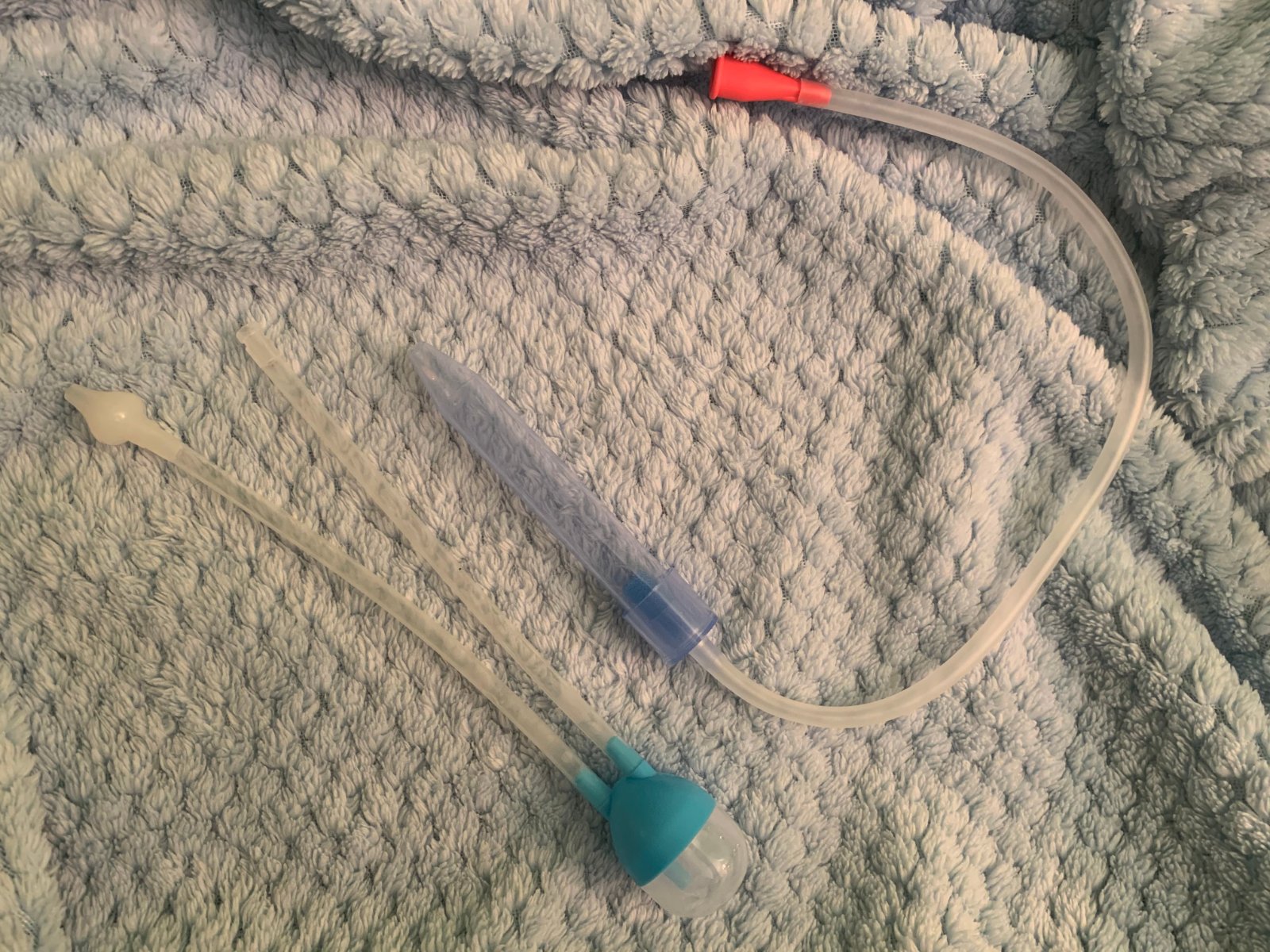 Jako první jsme hned dopoledne vyzkoušeli NoseFrida - nosní odsávačka. Na obrázku níže je vpravo. Vlevo je odsávačka, kterou jsem používala doteď. Stará odsávačka měla moc úzkou část, která se strká do nosánku. Takže když se kluci vrtěli, moc je to bolelo.