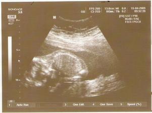 15.4. - kontrola proběhla v pořádku, mimi na nás strkalo záda, nechtělo se ukázat, ale jelikož jsem pana doktora prosila o fotečku, tak se snažil ho najít z boku - musel z boku mého břicha hledat až ho našel v přijatelné poloze... - vidíte na uzv - cucá si palec u nohy. Jen mě někdo uklidněte... že to že tam jsou vidět jen prtavé ruce, že je to tím, že je nechytil uzv? že je mimi v pořádku???