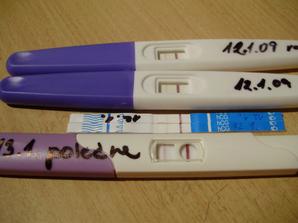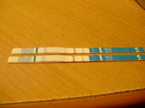 neustále jsem trpěla nechutenstvím a tak jsem si 12.1.2009 udělala první test, který jsem zahodila, protože se mi moč dostala do toho kontrolního okénka, tak jsem si říkala, že to stejně bude špatný výsledek - navíc se ani nechtěl zbarvit, prostě to nic nedělalo. tak jsem ho vyhodila ale asi po půl hodině mi to nedalo, vyhrabala jsem ho (fuj...) a světe div se, byly tam //. říkala jsem si, že je to po limitu, tak jsem jela do města pro druhý a tam si dala záležet aby to proběhlo dobře a v limitu se tam ty // objevili znovu... a pak znovu a znovu...