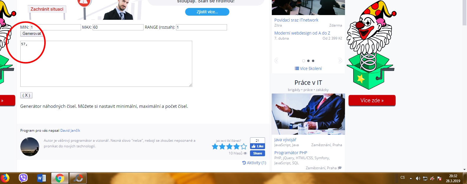 Soutěže se vás zúčastnilo krásných rovných 60! Jako obvykle, výherkyni vylosuje generátor náhodných čísel ze stránek https://www.itnetwork.cz/javascript-online-generator-nahodnych-random-cisel-se-zvolitelnym-rozsahem