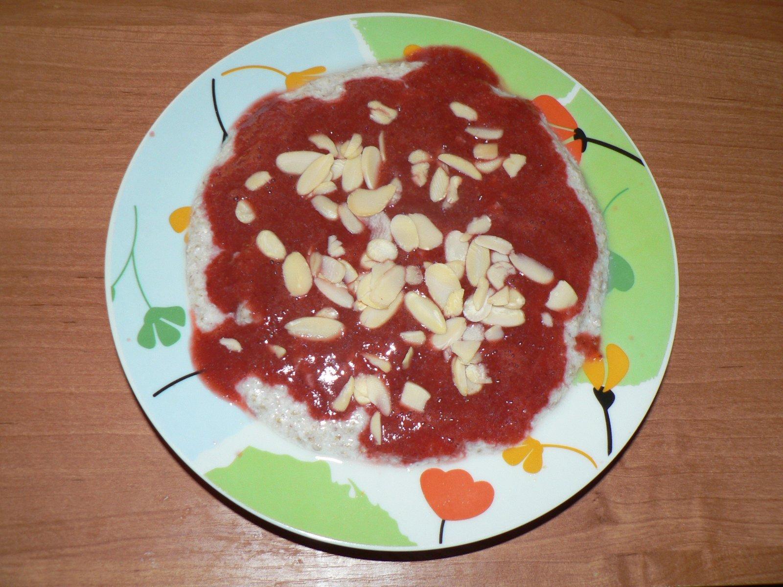 SNÍDANĚ: pohanková kaše s jahodovým přelivem a mandlemi (jahody už jsme dostali rozmixované, domácí od babičky ze zahrádky tak jsme využili takto)