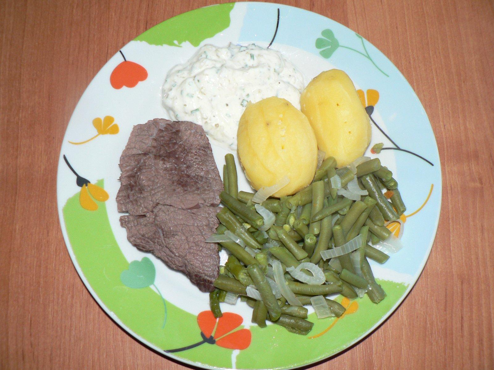 OBĚD: plátek vařeného hovězího, fazolové lusky, brambor a jogurt a´la tatarka
