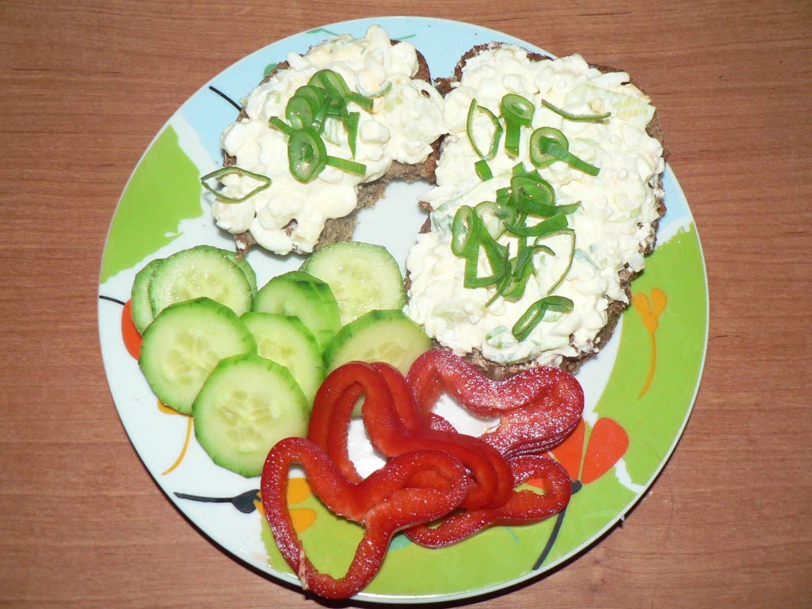SNÍDANĚ: domácí celozrnný slunečnicový chléb, cottage pomazánka, zelenina