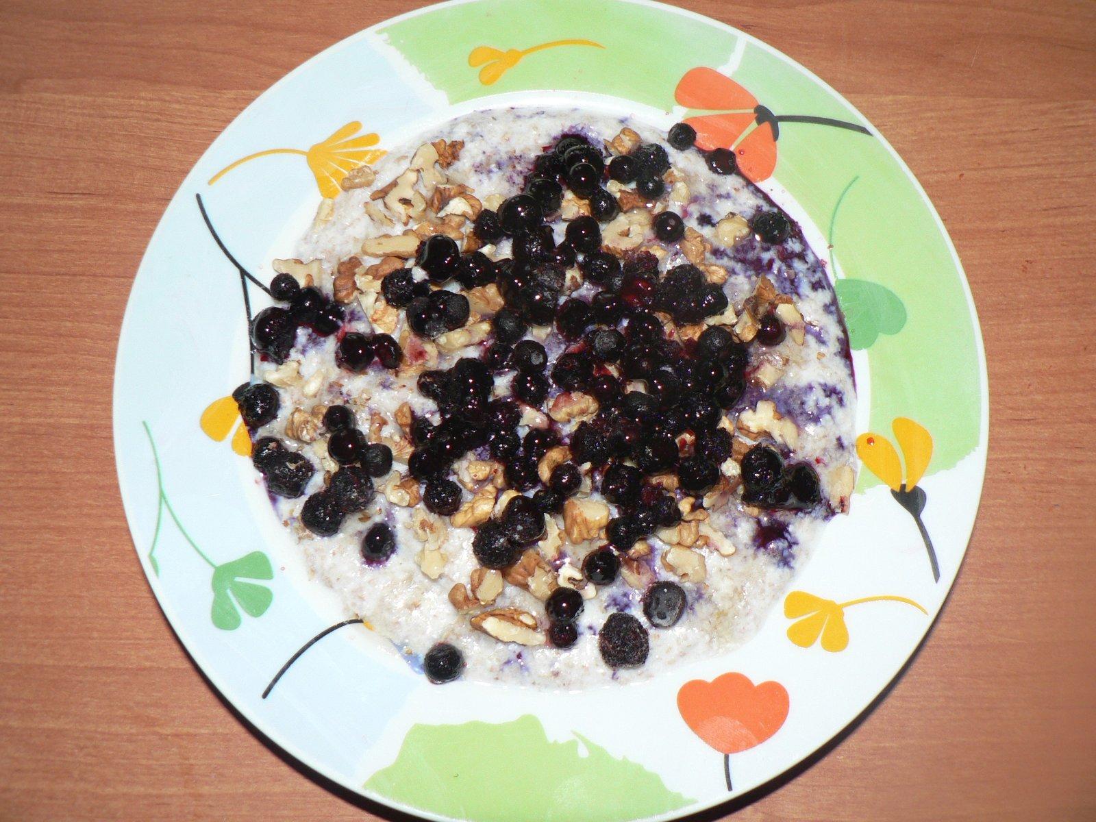 SNÍDANĚ: domácí pohanková kaše s vlašskými ořechy, lesními borůvkami z mrazáku a trocha agave sirupu