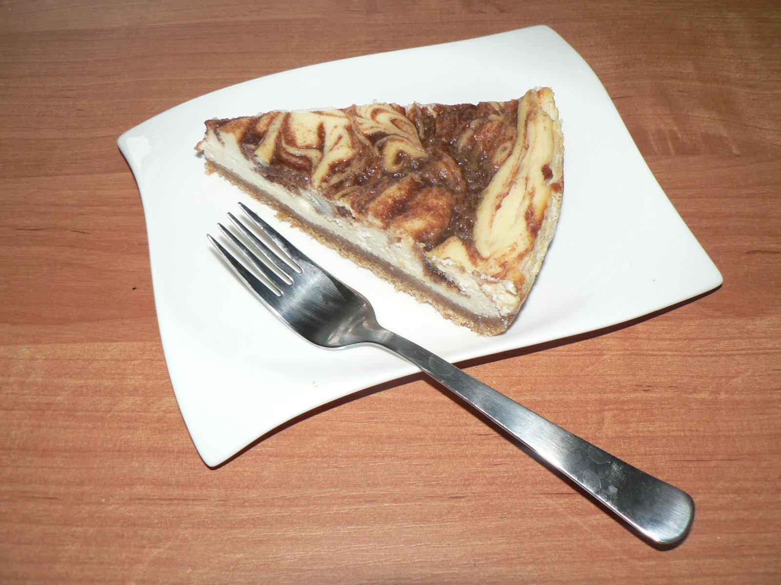 SNÍDANĚ: "ozdravený" tvarohový koláč se skořicí (spodek celozrnné sušenky, tvaroh slazený kukuřičným sirupem a v polevě třtinový cukr)