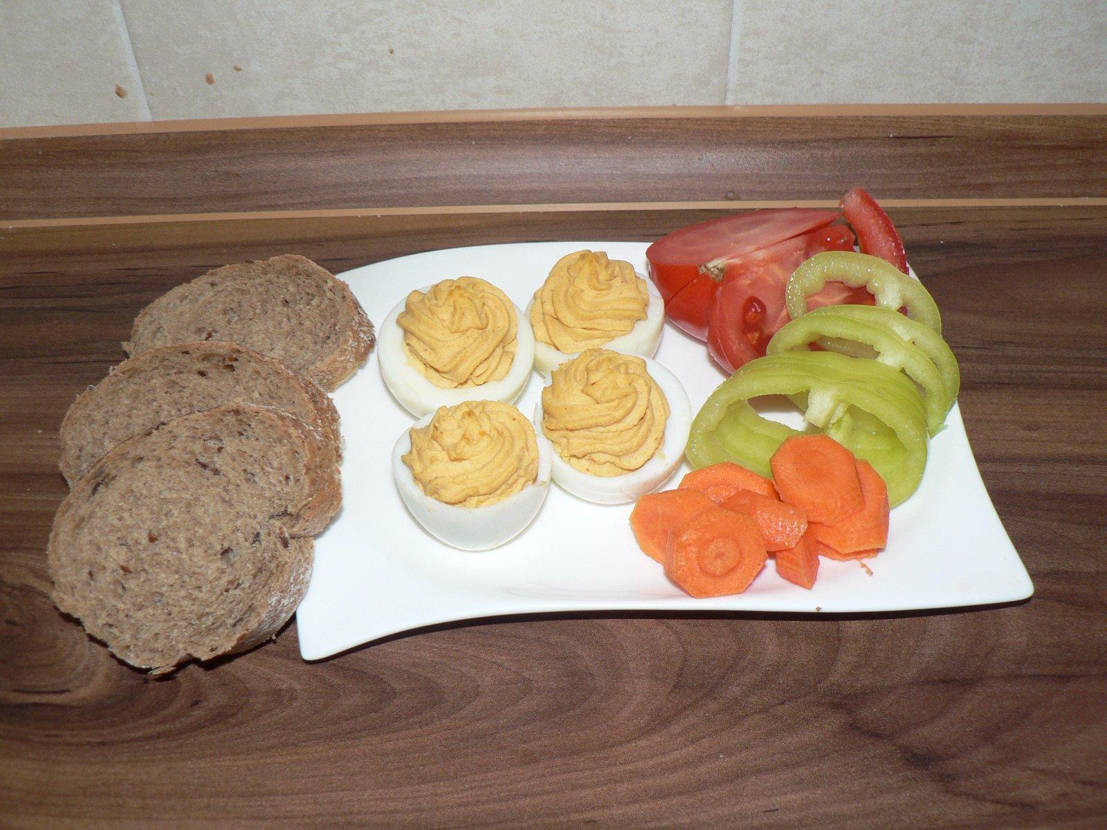 SNÍDANĚ: povelikonoční klasika :-D plněná vejce (žloutky ušlehané s lučinou a gervais), tmavá bagetka, zelenina
