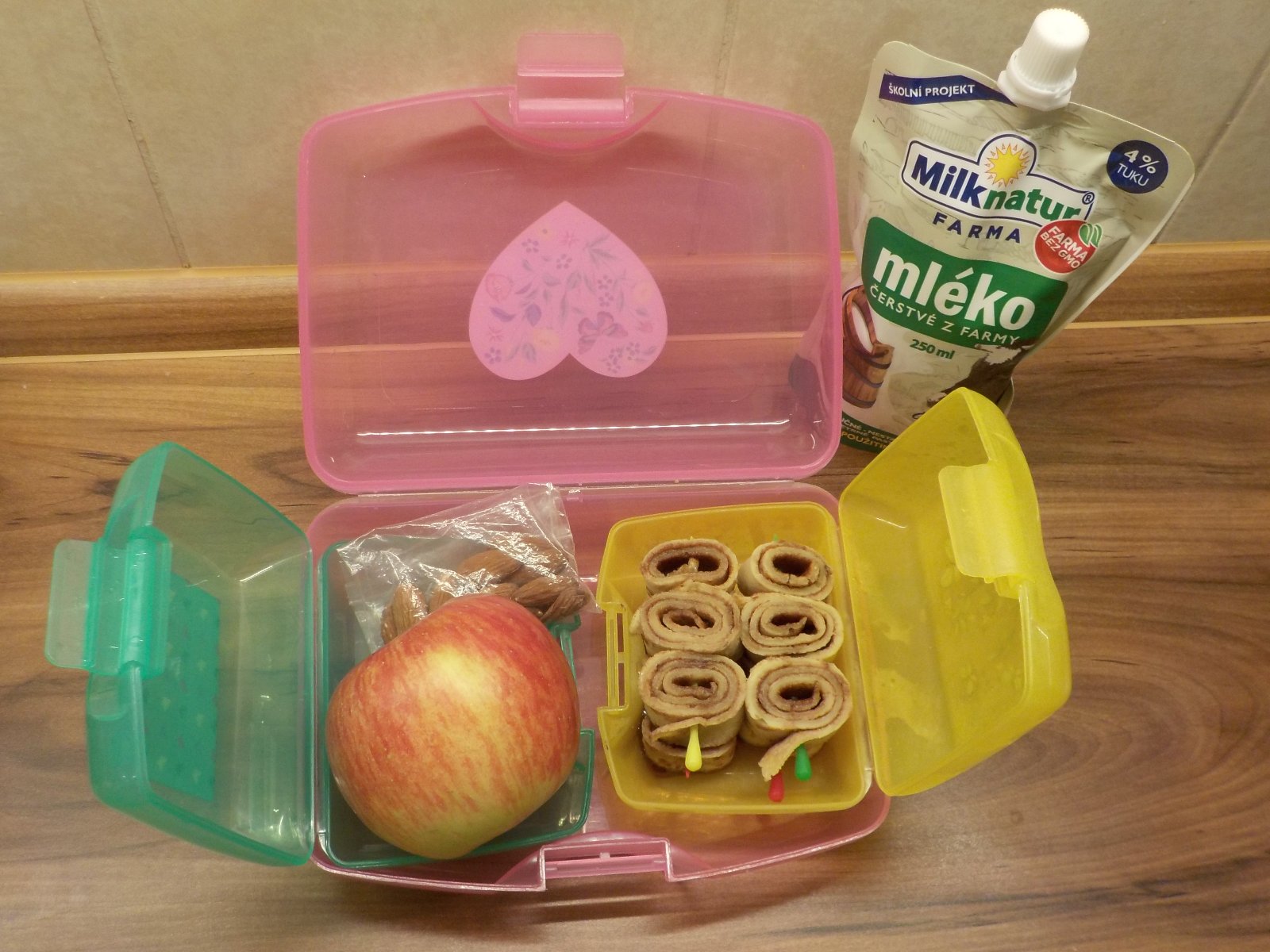 Palačinka s pomerančovou medutelou, jablíčko (tatínek ráno nakrájel), mléko a pár mandlí