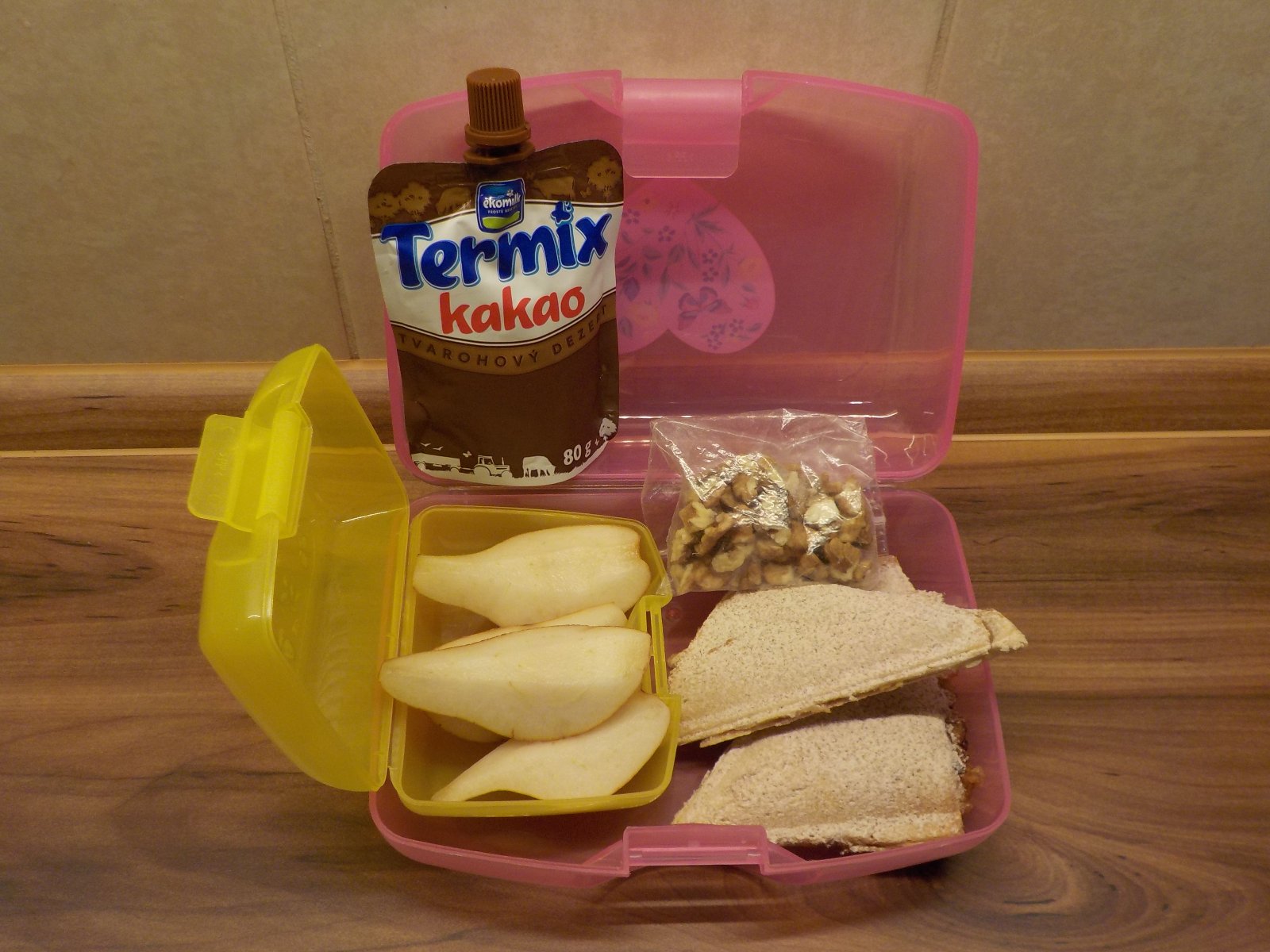 toust na sladko (s tvarohem, nastrouhaným jablíčkem a skořicovým cukrem), hruška, vlašské ořechy, termix - tohle jsem nevěřila že vše sní a snědla! (ale asi se o svačiny i trochu dělí :-))