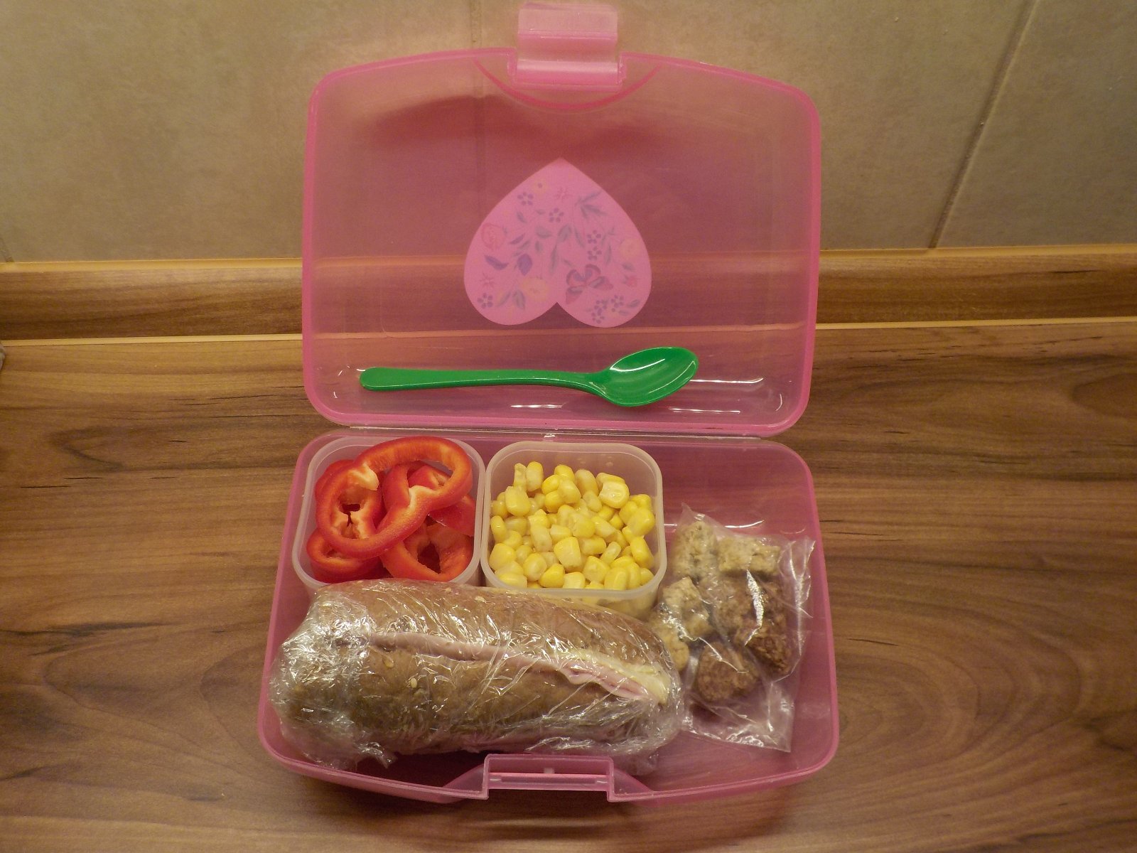 polovina dýňového rohlíku se šunkou a tvrdým sýrem (Lipánek, ten máme všichni nejradši :-D), červená paprika, kukuřice, pár musli srdíček (o ty se prý skoro o všechny rozdělila :-D)
