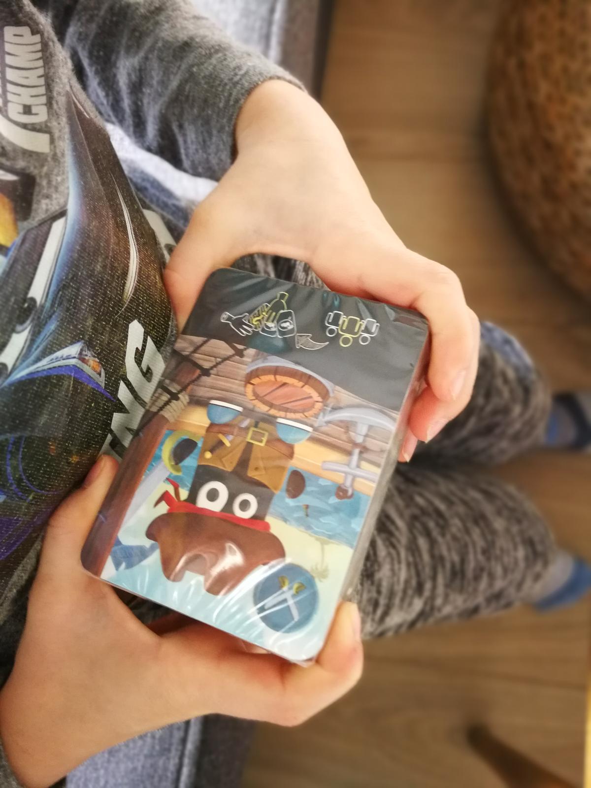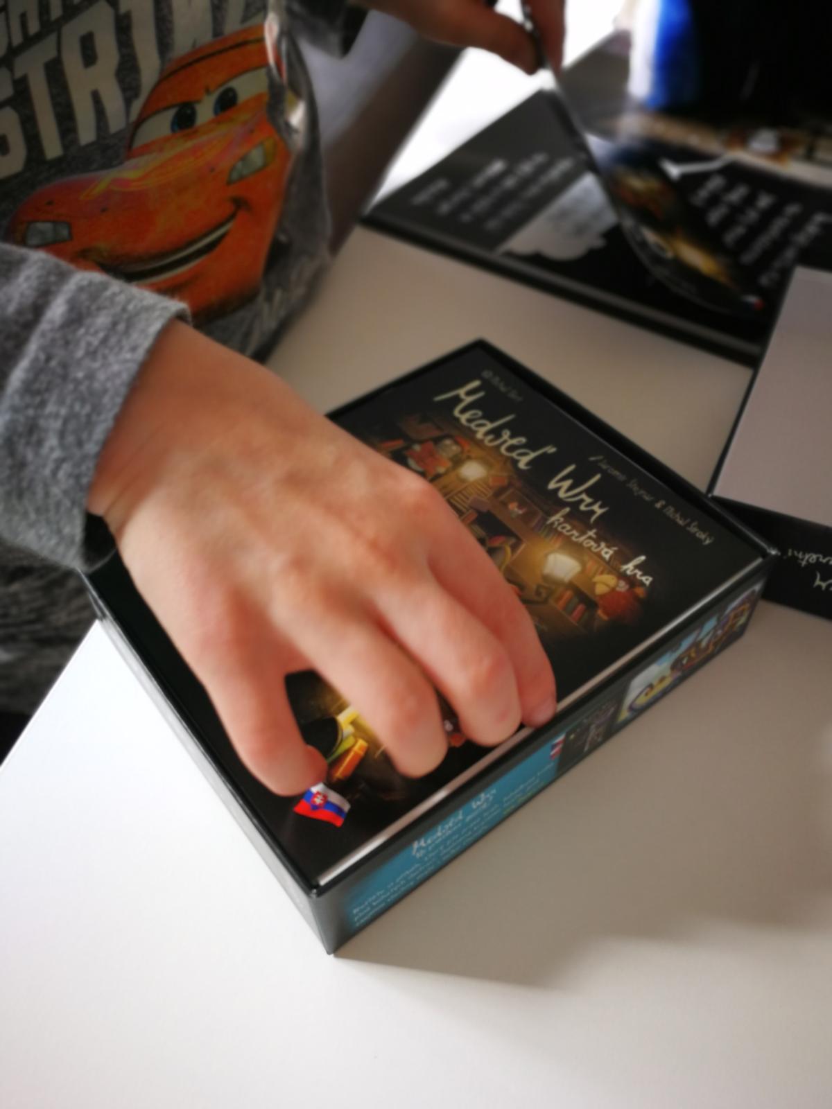 Grafické zpracování pěkné, jen trošku ponuré (ale to zase korespondovalo s příběhem z knížky, jak jsme později večer zjistili). Gramáž papíru karet akorát, pouze neochmatané nové karty dost klouzaly po sobě, což nám pak vykompenzovala roční cácorka s křupkami v ruce (zasloužilé matky tuší, že lepivý kukuřičný blemc byl pak všude). Mě fascinovala krabička - tedy její vnitřní vložka, takové origami jsem dlouho neviděla.