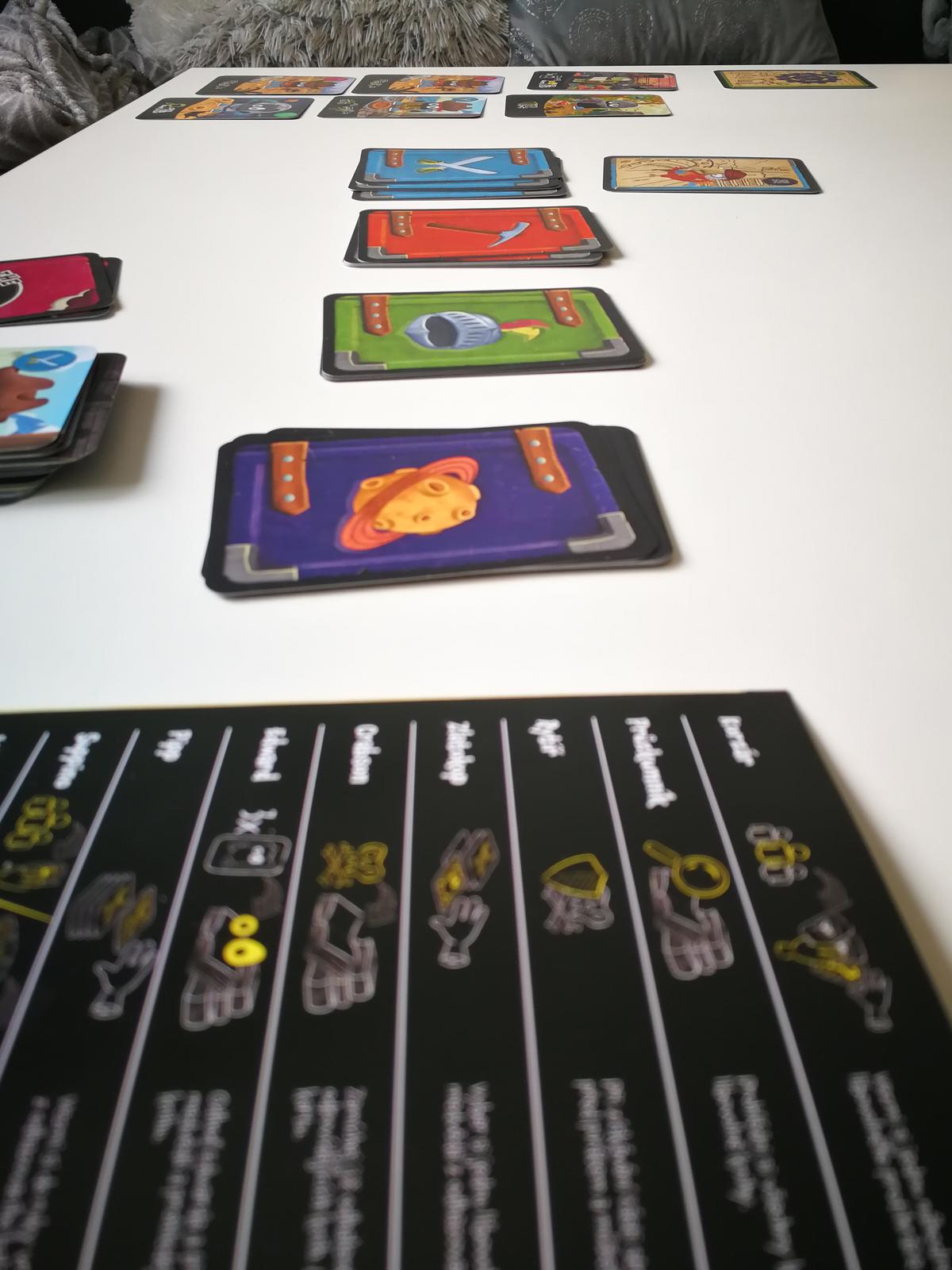 A pak přišla na řadu pravidla... můj ty světe! Díky deskoherní průpravě jsem už zvyklá na ledacos. Systém hry jsme tedy pochopili ihned, v tom problém nebyl. Kámen úrazu se u nás objevil v momentě, kdy pětileťák měl vybírat nějakou z akcí. Mohl použít schopnost jedné z postav, zkusit najít v balíčcích chybějící součástku nebo vyčkávat a shromažďovat tak potřebné karty. Nebyl schopen držet nějakou taktiku. Takže první hru pořád jen prozkoumával jednotlivé hromádky, klidně i třikrát za sebou tu stejnou, já mu do toho nemluvila...
