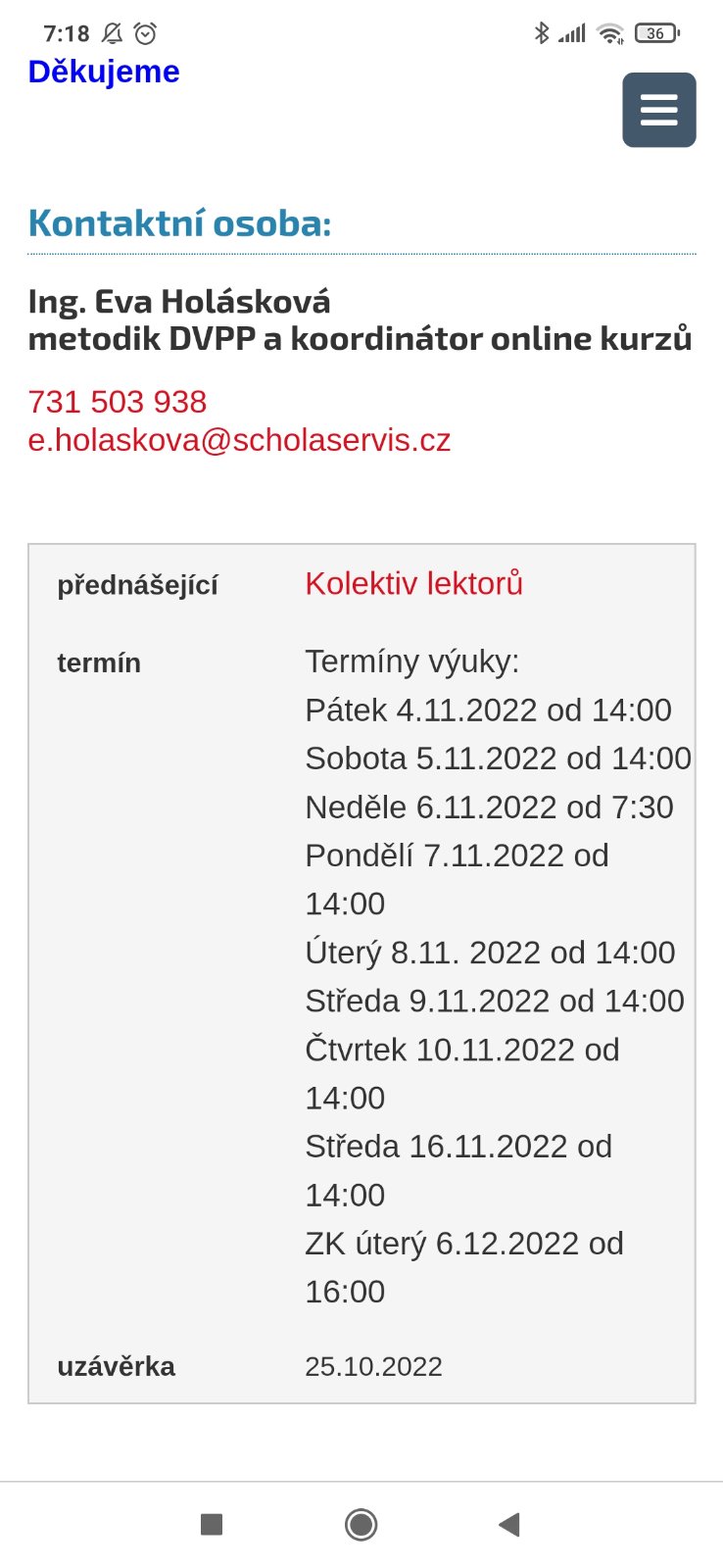 Holky,dívala sem se na Scholaservis,takže asi přes to bych do toho šla....ovšem nevím,jak mi to umožní/neumožní v práci....přece jen to nějaký čas sežere a bohužel k nynější práci to nepotřebuju,tak aby mě s tím neposlali někam....dívala sem se,že je to 80h teorie a je to jen 8 dní,to znamená,že každý den bude 10h?! A pak 40h praxe...jak probíhá online zkouška a závěrečná práce? Vůbec hlavně nechápu to časový rozvržení....díky....