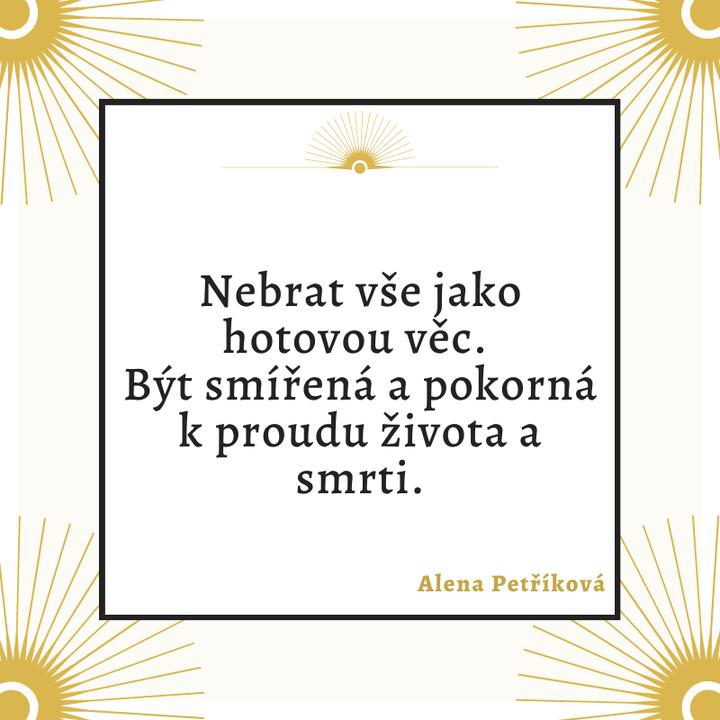 S touhle myšlenkou totiž úplně souzním a zabrnkala na moji notu. Uvědomění si pokory k životu, obdivovat jej jako dar. A zároveň si na něj nedělat nárok. Přijmout smrt jako přirozenou a nedílnou součást naší existence...