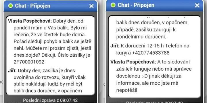 Na infolinku se člověk nedovolá tak aspoň Jiříček mi odpověděl 😀 Zajímavý je, že člověk napíše a hned v zápětí mu přijde email že balík dojde dnes 😀 Sem si s Jirkou chtěla pokecat a on se mi odpojil ☹ Tak aspoň že balík dojde 😀 😀