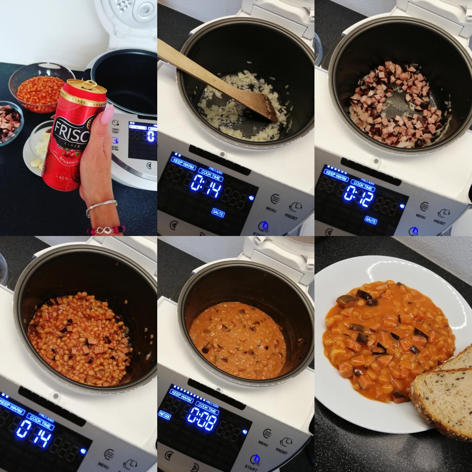 Zapneme program "osmahnout" a přidáme olej a cibuli. Přepneme na program "rychlé vaření" a přidáme fazole, kečup, česnek, sůl, pepř, lehce červené pálivé papriky a promícháme. Na zjemnění dávám plnotučné mléko nebo trochu smetany. Nevím jestli to někdo dává, ale mě to s tím chutná víc. Výhoda plechovky je, že nemusíte fazole den předem namáčet. To na dovolené vlastně asi ani nejde.