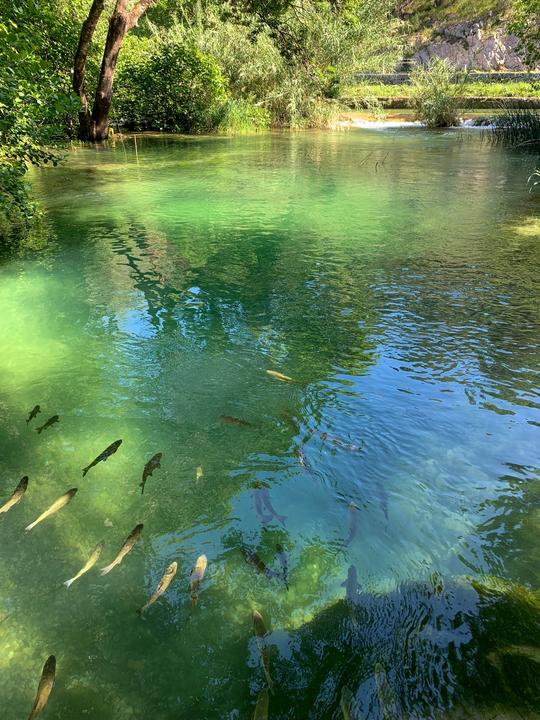 Vyrazili jsme ze Skradinu lodí (vstupů je do NP Krka několik, kdyžtak koukněte na www.np-krka.hr ). Bylo sice vedro, toho jsme se báli, že se budeme vařit ve vlastní šťávě, ale od vody to příjemně foukalo💙. Pak už jsme chodili vesměs skrytí ve stínu stromů nebo nás ovíval vánek tekoucí vody.💚