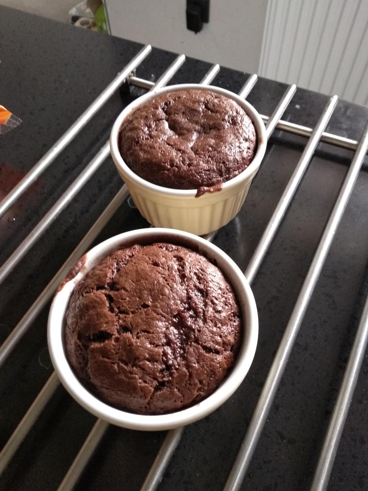 Začneme šlehat vajíčko a žloutek s třtinovým cukrem a až máme pěnu, přidáme dvě lžíce mouky. Poté do vaječné směsi přidáme čokoládovou směs a nalijeme do vymazaných zapékacích, muffinových příp. jiných misek, které jsou vysypané kakaem. Jak už jsem psala výše, můžeme to nechat ve formičkách v lednici, ale já jsem hned pekla 8 minut na 180°C. A bud necháme v mističkách (jako já🙂) nebo vyklopíme na talířek. Ideální je, když uvnitř těsto trošku teče, ale nemusíte se bát, je to hotové 🙂 A můžeme přidat malinový přeliv, jahodový či čerstvé ovoce.
