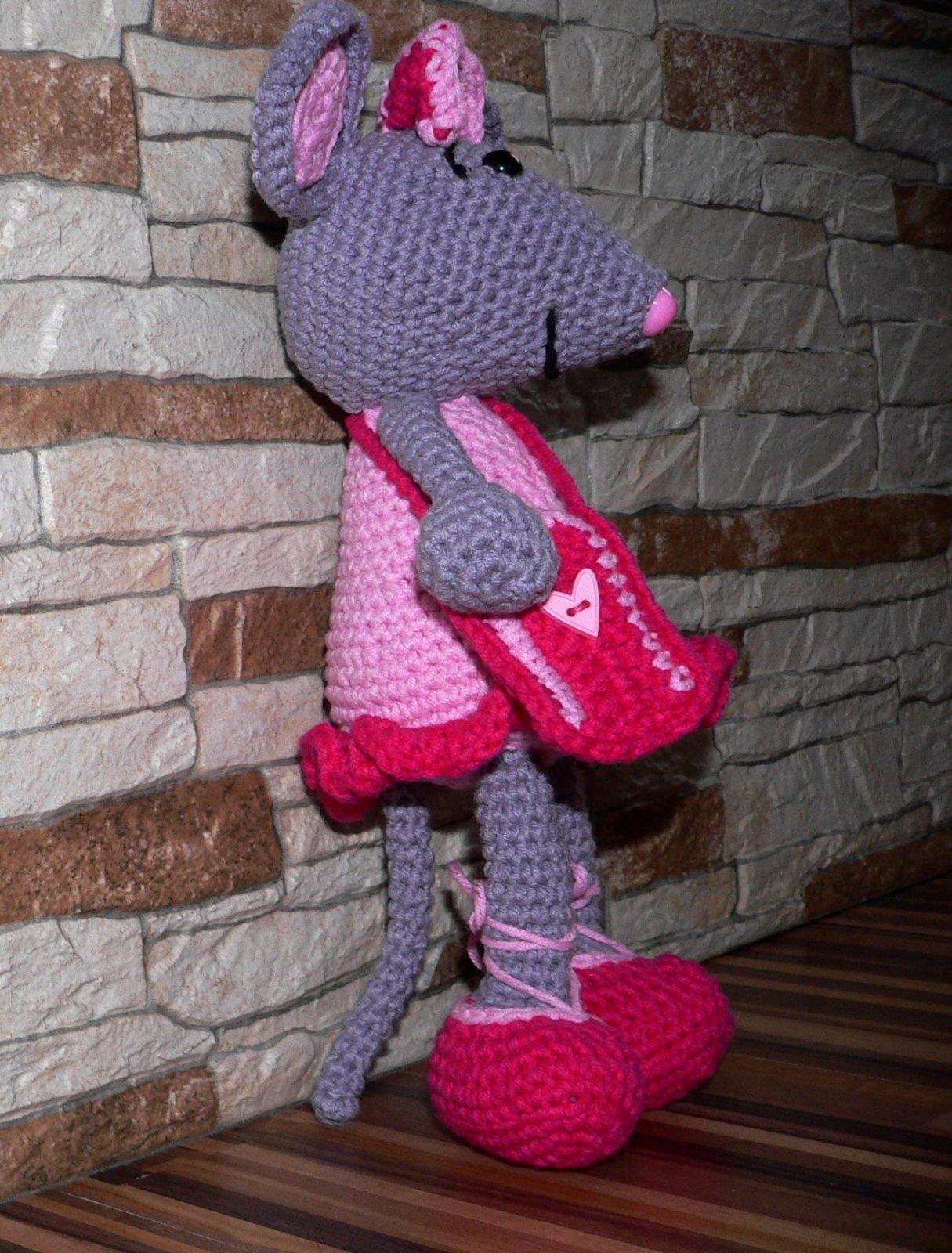 Myška s kabelkou, výška 28,5cm, materiál Bavlna (45%) + acryl (55%), výplň PES kuličky (vhodné i pro alergiky), bezpečnostní očička i čumáček, v tělíčku jsou rolničky (