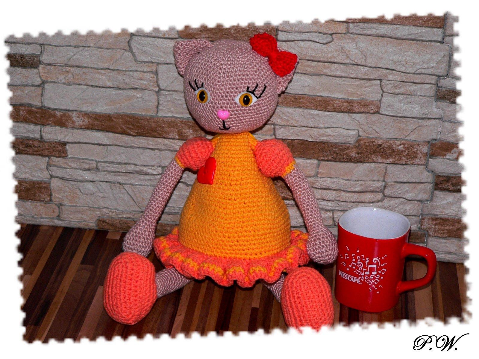 kočička vysoká cca 42cm, mateiál - tělíčko, volánky a botičky směs bavlna + acryl. Hlavička a končetiny - bambus.