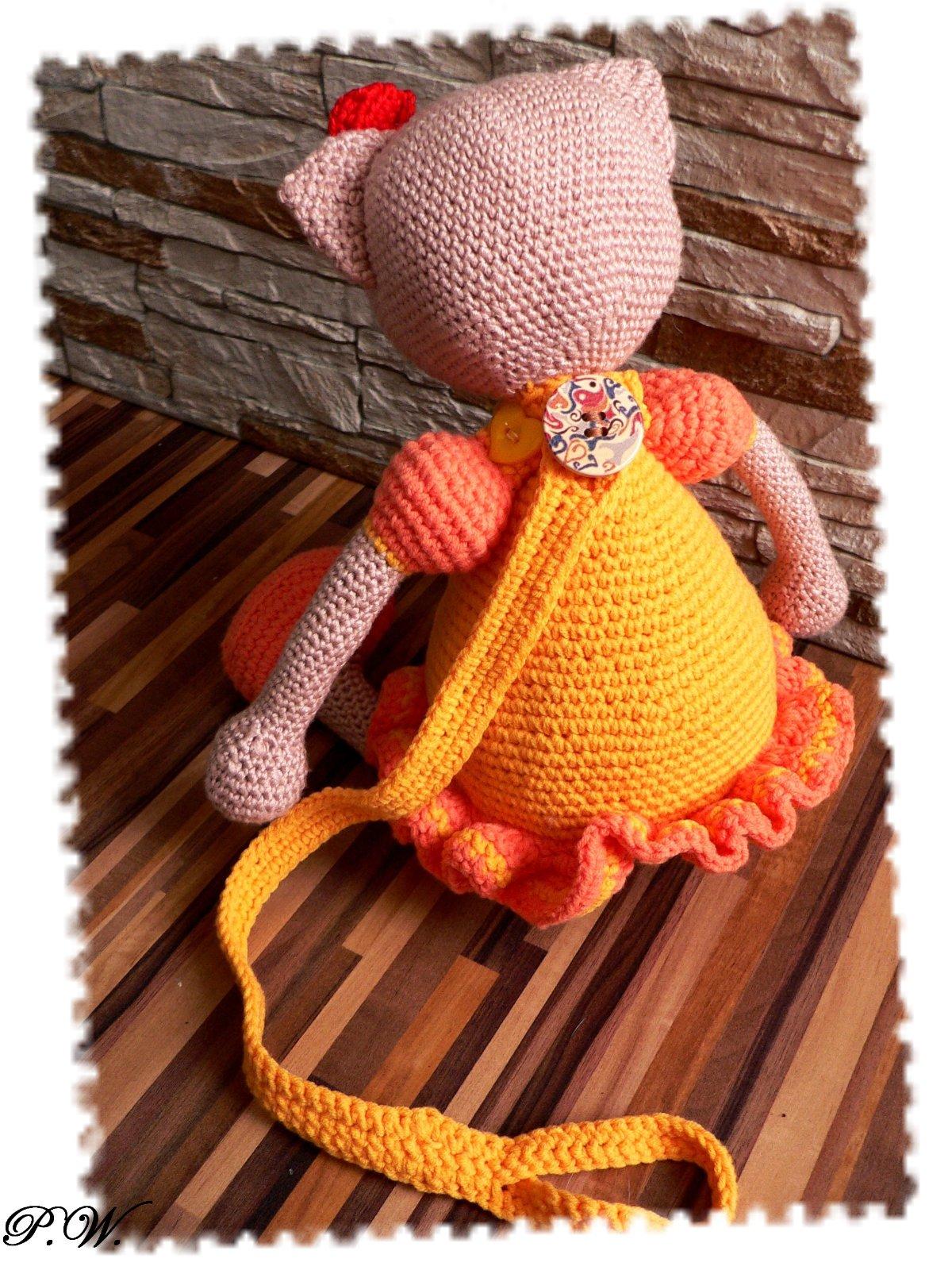 kočička vysoká cca 42cm, mateiál - tělíčko, volánky a botičky směs bavlna + acryl. Hlavička a končetiny - bambus.