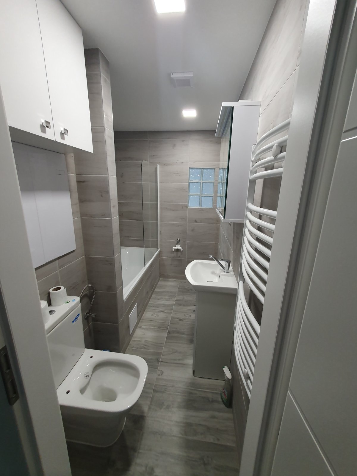 Určitě na WC spršku a malé umyvadélko. Obklady nemusí být až do stropu, na WC stačí třeba 150cm na výšku, aby to bylo pohodlné kolem toho umyvadla, v koupelně máme od stropu nechaných cca 30 cm malby, nevidím důvod dělat to až ke stropu. Obklady světlé. Ne ty úplně obří, spíš nějakou střední velikost. Pozor, na prolamované nejde dát nic s přísavkou. Ani na matné. Dnes už se dají koupit různé doplňky s přísavkou, abys nemusela vrtat, na naše matné to nedrží☹️ Udělej si plánek v měřítku, vystříhni si vanu, umyvadlo, skříňku, pračku a šoupej si s vybavením. Kolikrát člověka napadne i jiné řešení. V paneláku bych se vykašlala na topný žebřík.