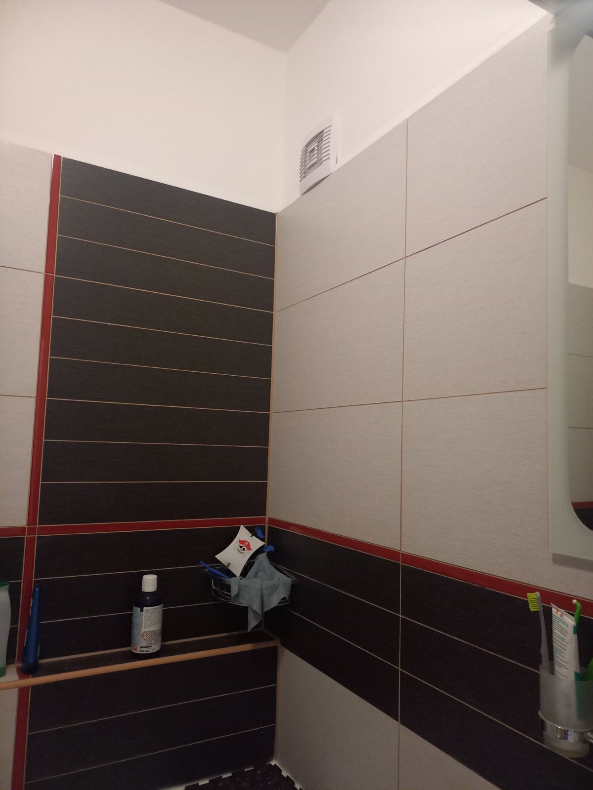 Sháněla jsem kachličky,aby se nám líbily a pak nebyly k dostání a museli jsme na rychlo prostě nějaký vybrat a výběr malej.Mame tmavě fialový s béžovou a pruh s kruhy na béžových.Vybrala bych teď do bíla,ale je fakt, že na těch tmavých není vidět bordel .Máme je do 3/4 stěny,zbytek bílá barva.Na stropě bodovky.Umyvadlo se skříňkou co visí ve vzduchu.Skříňku se zrcadlem a klasický pračku se sušičkou v rohu.Máme větší klasickou vanu a i po dvou letech strašně klouže.A malej elektrickej žebřík,ale vůbec ho nezapínáme.