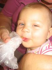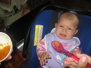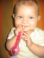 hačáme bez držení, pořád couváme a jak se umíme vztekat, když nedostanem hned napapat.. baštíme všechno - zeleninu, ovoce, maso.. nejlepší je,a le stejně ke svačině brumík 🙂
