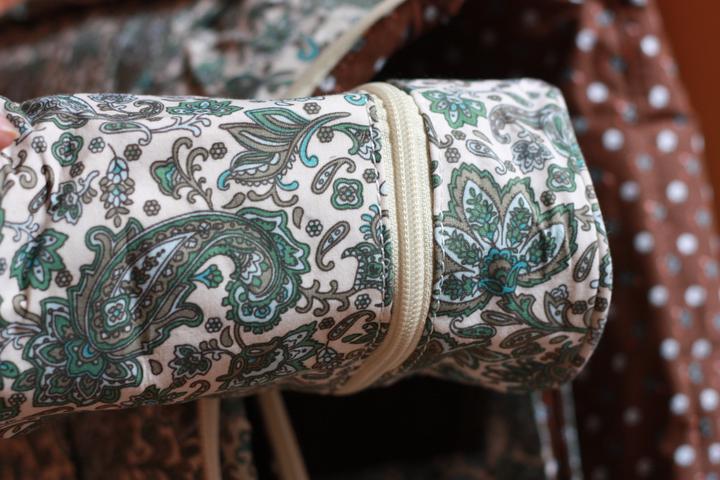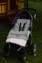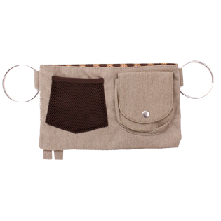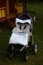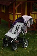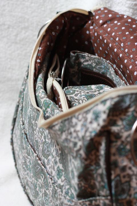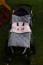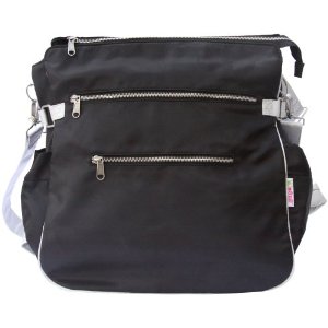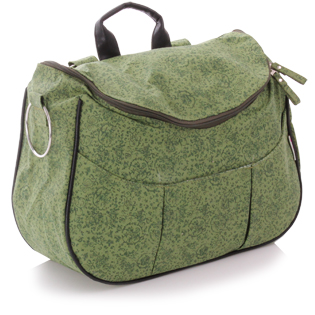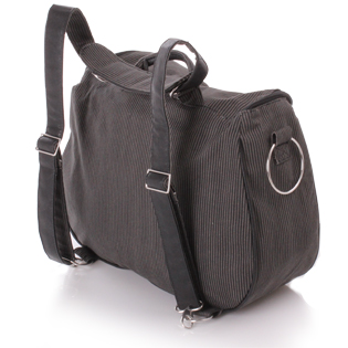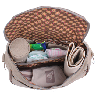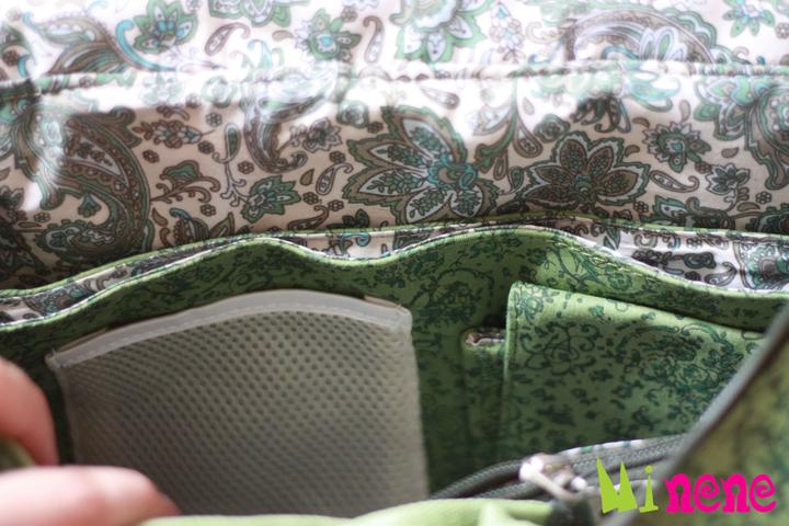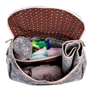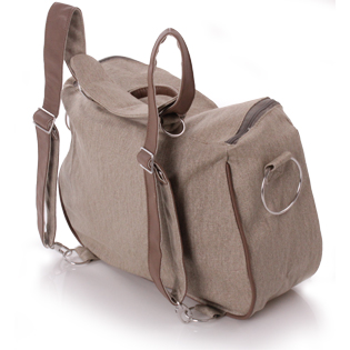 Je z odolného šusťáku, má mnoho kapes - dvě vnější z přední strany, tajnou kapsu na zádech - tam je ukryta přebalovací podložka, dvě postranní termo kapsy na lahvičky, a v hlavním oddílu je několik bočních kapes a velká kapsa je rozdělena na dvě přepážkou. Podšívka je z nádherného jemného sametu - u černo.stříbrné varianty je to černá s kytičkama, u šedo-červené varianty je podšívka červeno-bílé kostičky, a u variant pískovo-hnědá a hnědo-písková je podšívka hnědá s kytičkama.