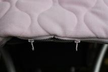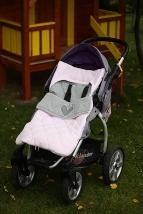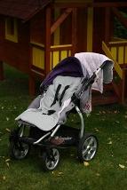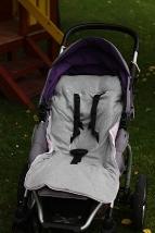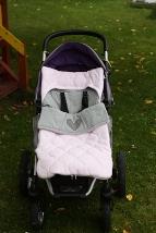 Kombinace šedá/růžová se srdíčkem je vhodná pro malé princezničky. Má pět otvorů pro popruhy a sedí na všechny standardní kočárky. Nahoře se ohýbá přes opěrku, a tak nesjíždí. Některé mamky vrchní díl berou jako kapuci pro mimča, které v kočárku ještě leží.