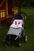 Kombinace šedá/růžová s výšivkou SWEET je vhodná pro malé princezničky.. Má pět otvorů pro popruhy a sedí na šechny standartní kočárky. Nahoře se ohýbá přes opěrku, a tak nesjíždí. Některé mamky vrchní díl berou jako kapuci pro mimča, které v kočárku ještě leží.
