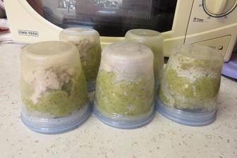 Vždy nakrájím zeleninu na malé kousky, maso většinou na větší a povařím. Vařím zalité kojeneckou vodou. Po uvaření první mixuji maso, pak přidám zeleninu, olej a případně kojeneckou vodu, aby to nebylo husté. Horké dám do skleničky, nebo via pohárku, navážím a otočím dnem vzhůru a schládlé dám do ledničky a mám na pár dní navařeno.