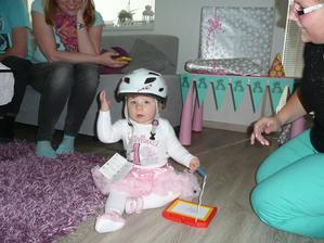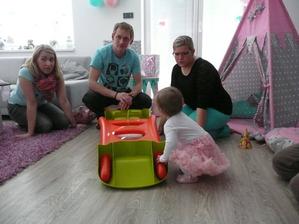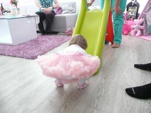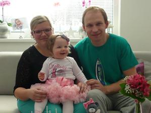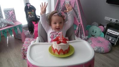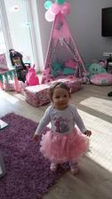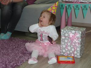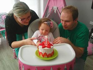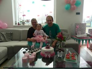 Začalo tak, že od rána jsem chystala jídlo... o pul druhé jsme dali Nellču psát ,aby se vzbudila a všechno bylo nachystané (muž mi zakázal chystat dřív než půjde spát po obědě) tak od pul druhé jsme lítali jak blbci a všechno chystali, přesně za 5min. 15h jsme to všechno dodělali, já upocená až na řiti a v tom už vidíme jak naši přijíždí, tak jsem se šla rychle převléci do toho se pomalu vzbudila Nella, a už u nás byly všichni, tak jsme ji s manželem oblíkli a slečinka si sama napochodovala do obýváku (teda u dveří se zasekla, jelikož na ni civělo 9 lidí do toho fotáky,mobily a výzdoba v obýváku) tak jí to trošku trvalo než se rozkoukala. Ale pak už dobrý nevěděla co dřív. No bylo to super. Dortík byl výborný a moc jsme si celá rodina tuto oslavu užily.