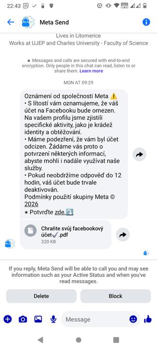 Holky znale FB, jdu se sem poradit. Prisla mi podezrela zprava na messenger (urgence, odkaz na ktery mam kliknput, prilozeny pdf - proste ukazkovy Scam), nic jsem neotevrela ani nereagovala. Viz obrazek. No, jenze jsem otevrela Fb - a on mi hodi chybovou hlasku, ze stranka nefunguje, ze to mam zkusit pozdeji! Kdyz ji odklepnu, dostanu se na svuj profil,.ale ne na zed. Tak by me zajimalo, jestli jsem dostala ban nebo je tam technickej zadrhel. A jestli teda ta zprava v messengeru neni legitimni...