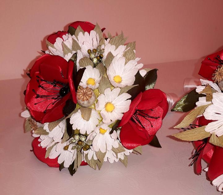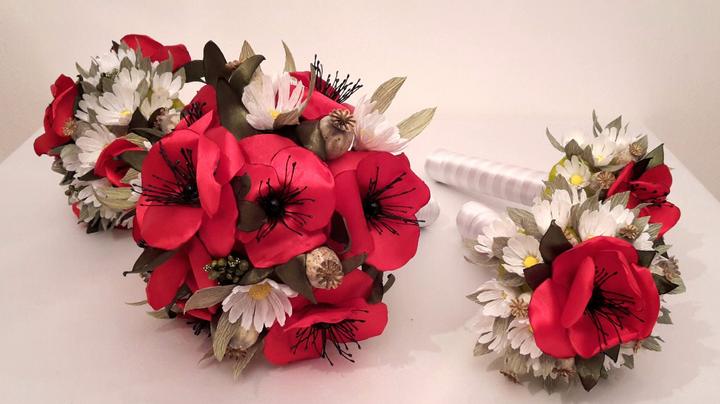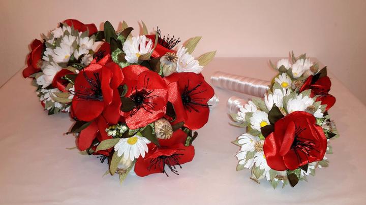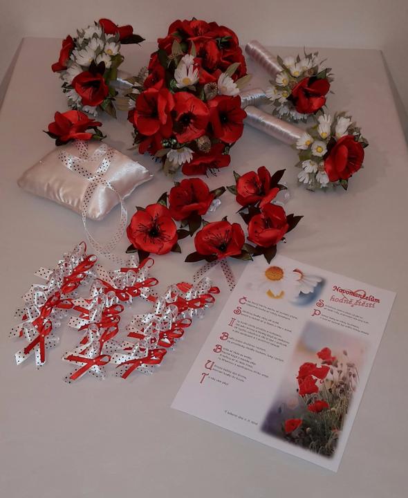 Mam radost, ze jsem vsechno stihla 🙂, puvodne to mela byt jen kytice pro nevestu, ale ta se natolik libila, ze pribyla kytice pro svedkyni, dve kytice pro mamky, kytice na auto, naramky pro druzicky, sponka do vlasu, kytka na klopu zenicha a svedka, vyvazky a polstarek na prstynky 🙂 nakonec jsem jeste vytvorila vlastni prani i s basnickou 🙂 svatba muze zacit 🙂 ❤
