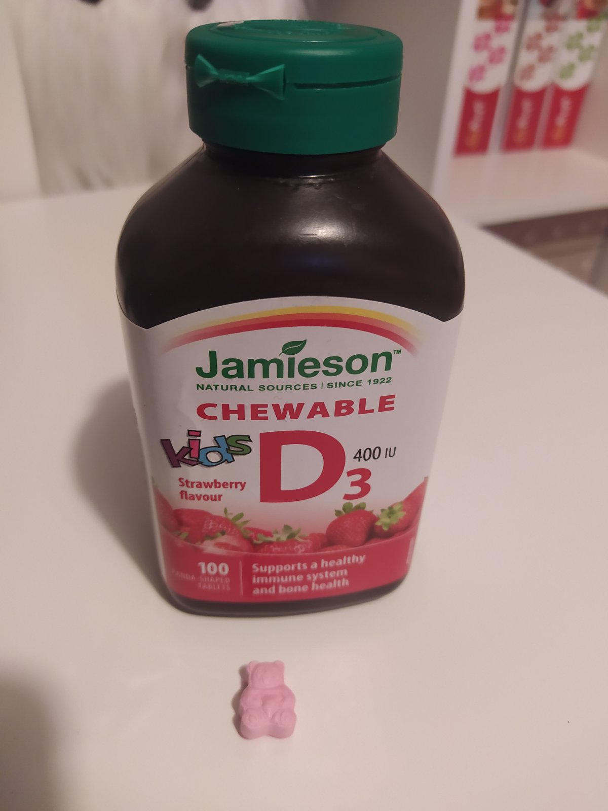 Jamieson Vitamín D3 Kids tablety na cucání s příchutí jahody 400IU pro děti 100tbl.